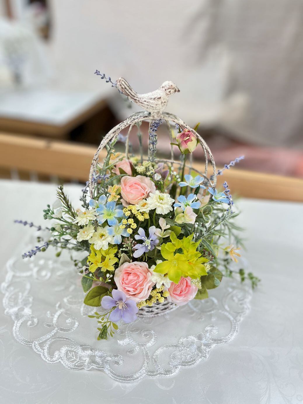 鳥かごアレンジは、自然の美しさと手作りの温かさを感じることができるアイテムです。鳥かごの中には、季節に合わせたお花やグリーンが華やかにアレンジされており、インテリアに華やかさとほっとした癒しをプラスしてくれます。一つ一つ丁寧に作られているので、オンリーワンのデザインと味わいを楽しむことができます。また、お部屋に置いても、贈り物としても喜ばれる作品となると嬉しく思います