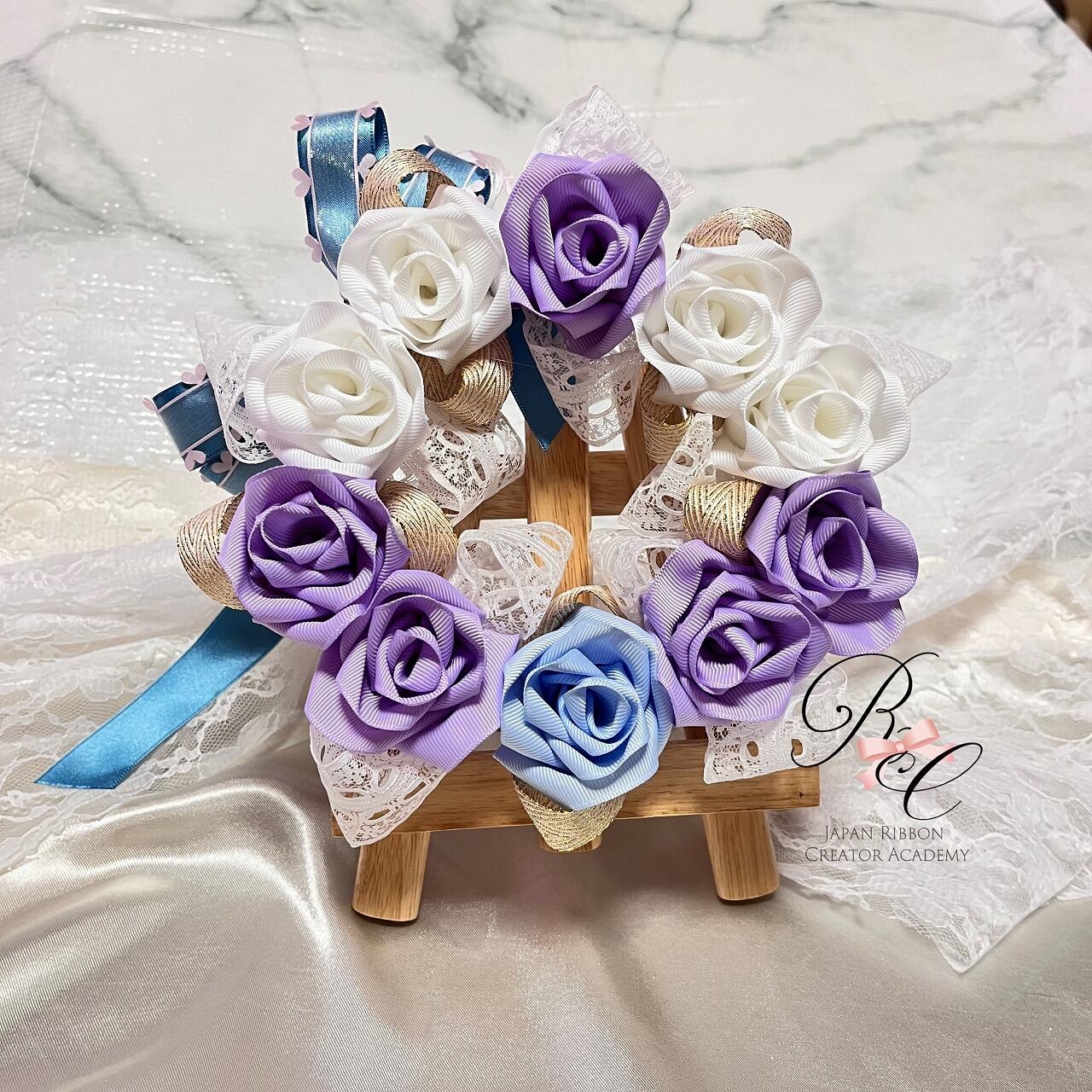 こちらはおリボンで表現する枯れない薔薇のリースになります